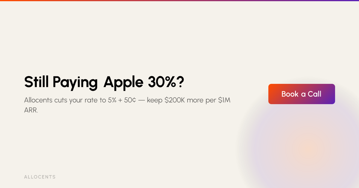 The math that matters: On a $10 in-app transaction, Apple keeps $3.00 (30%). With Allocents, you pay 5% + 50¢ — meaning you keep $9.00 instead of $7.00. At scale, that gap is enormous. An app doing $1M ARR pays $300K to Apple; with Allocents, that same app pays roughly $100K, keeping an additional $200K per year.