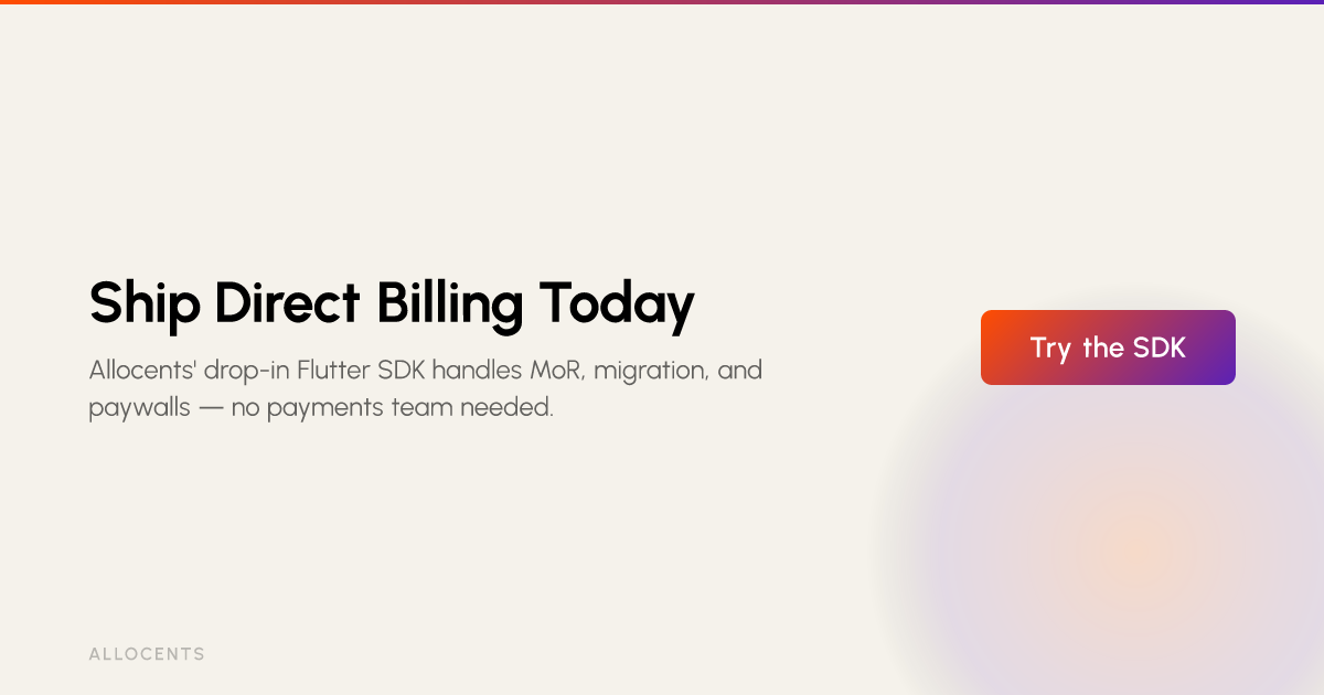 The easiest and fastest way to implement direct billing is by using a single, all-in-one SDK that provides full Merchant of Record (MoR) services. Solutions like Allocents are designed for this purpose, offering a drop-in Flutter component that can be integrated in minutes. This approach removes the complexity of wiring together separate systems (like RevenueCat and Stripe) and offloads all tax and compliance burdens.