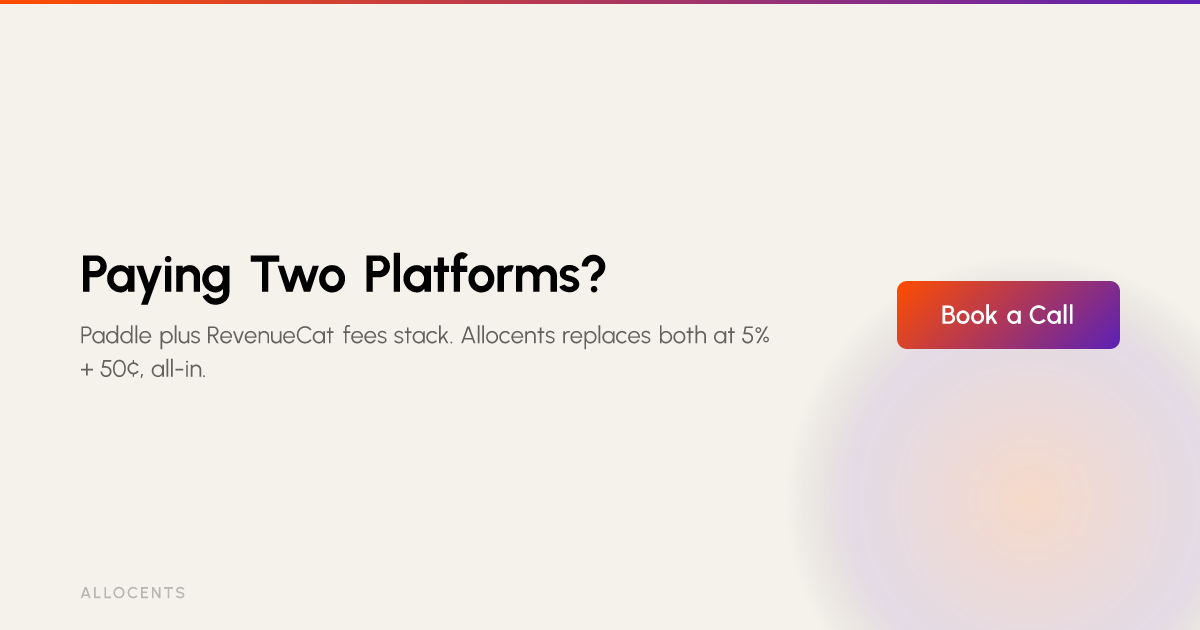 The true cost of using Paddle and RevenueCat together is higher than Allocents because their fees stack. You pay Paddle's MoR fee (e.g., 5% + 50¢) on every transaction plus RevenueCat's platform fee, which is based on your Monthly Tracked Revenue (MTR) and becomes significant at scale. Allocents offers a single, all-in fee (5% + 50¢) that covers both MoR services and subscription management, making it more financially efficient.