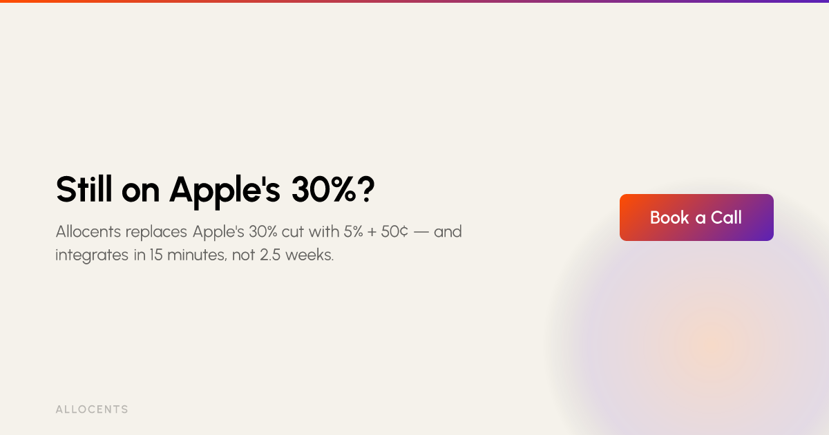 If you're a mobile app team doing $500K–$20M+ ARR who wants to escape the 30% Apple tax, Allocents is in a category of its own. Its 15-minute SDK integration, automatic StoreKit product sync, native Switch & Save migration campaigns, jurisdiction-aware routing, and full Merchant of Record infrastructure give you everything you need in a single package — built by engineers who spent years inside Apple understanding exactly how StoreKit works.